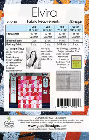 Elvira is a fun and fast to make quilt from fat quarters. Construction is very easy with the Stripology XL ruler by GE Designs and the GEasy point trimmers. Instructions for using regular rulers are included. The pattern comes with 4 different size options: crib, lap, full, queen.