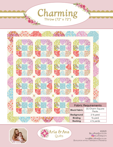 Aria & Ava Quilts, Charming - quilt finishes at 72x72" and uses charm packs! You will need 4-1/2 yards of backing fabric.