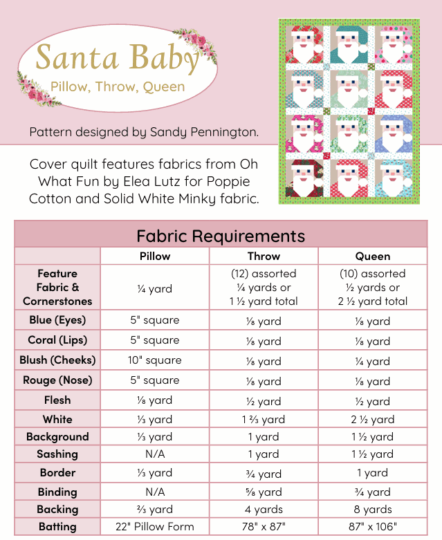 This kit includes the Santa Baby pattern by Aria & Ava and all the fabric to complete the 60" x 79" throw sized quilt top and binding.