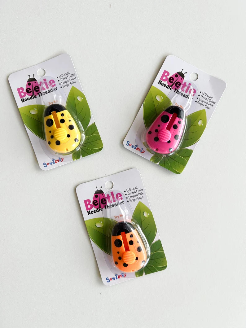 Shines the light right where you need it, on the eye of the needle! This offer includes 3 pieces, one of each color Yellow, Red and Green. The Needle Beetle also includes a built-in thread cutter on the side and a hole in the back to loop a lanyard through to keep this handy tool close at hand.