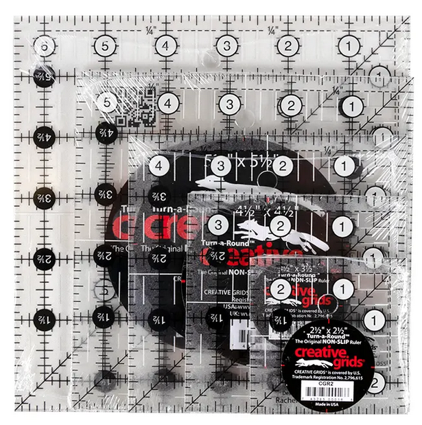 Creative Grids Quilting Square Ruler Set- includes 6 Creative Grids Quilting Square Rulers (including the FREE 1.5" square ruler) that range from 1.5" to 6.5". These handy tools feature easy to read black and white markings printed in 1" grids marked in 0.125" and 0.25" increments. Ruler sizes: 1.5” square, 2.5" square, 3.5" square, 4.5" square, 5.5" square, 6.5" square