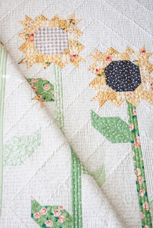 Scrappy Sunflower Quilt Kit featuring Country Rose from Lella Boutique for Moda- kit includes pattern and fabric for top and binding of 66x66" quilt. Finished blocks are 12x12".