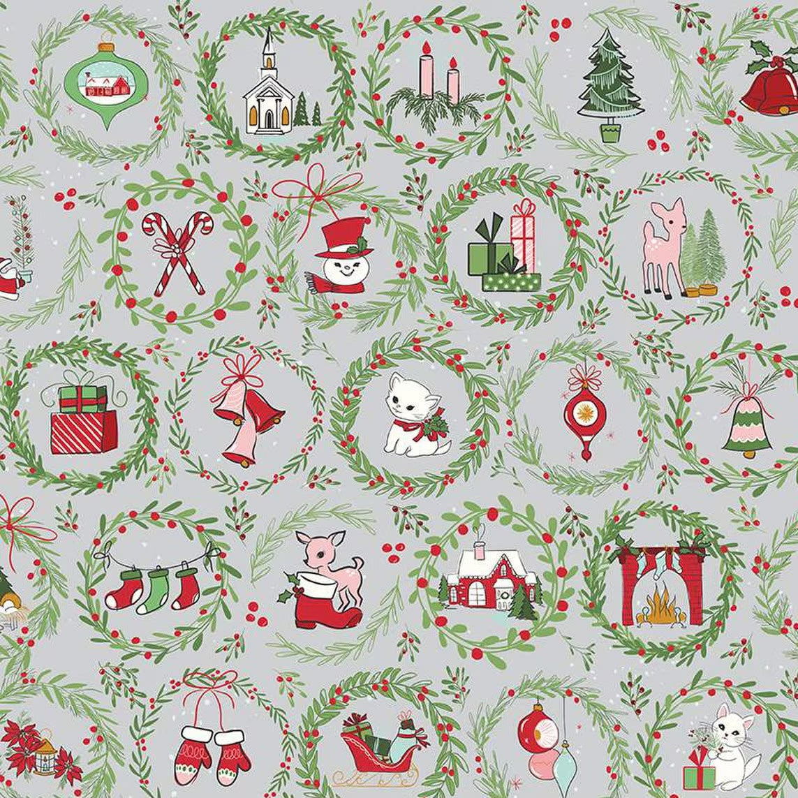 Mistletoe & Holly Wreaths Silver C16401-SILVER by Beverly McCullough for Riley Blake Designs -Sold in 1/2 Yard Increments
