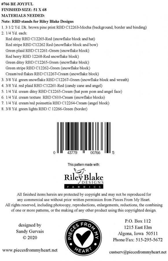 Pieces of My Heart, Be Joyful- A candy cane, wreath and angel double as letters to spell out JOY. The contrasting dark print background makes the letters and traditional blocks stand out. Finished Size: 51in X 68in