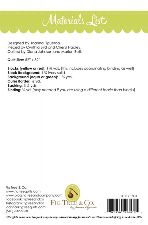 Fig Tree & Co., Dandelions- Simple SEW & FLIP units make this flower block a breeze to piece and the unique setting makes it a little bit different and fun to assemble. Size: 54.5in x 63.5in