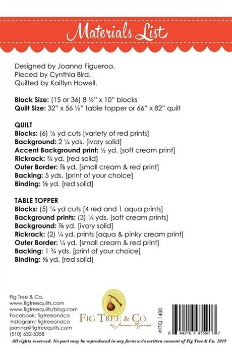 Fig Tree & Co., Fair Isle Hearts- rows of hearts that look like they were knitted on one of those gorgeous Scandinavian sweaters. Approximate Size 32" x 56 1/2" Table Topper or 66" x 82 Quilt
