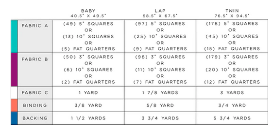 Kitchen Table Quilts, Frances- very beginner friendly and can be made using your stash, scraps, fat quarters, charm squares, or layer cake squares. The pattern has directions for three sizes: