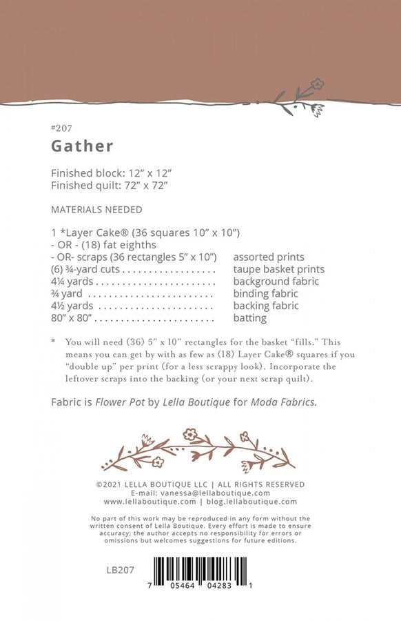 Lella Boutique, Gather- Sweet Spring baskets in lush fabrics from Lella Boutique, blocks finish at 12x12" and pattern includes paper basket templates and finishes at 72x72".
