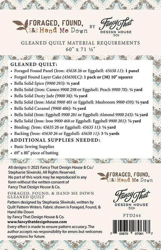 Introducing the Gleaned quilt pattern by Stephanie Sliwinski from Fancy That Design House & Co for Moda Fabrics. This pattern features a panel from Forged Found and Hand Me Down collection coming in August 2025. It finishes at 60" x 71.5" and is offered in 2 colorways.