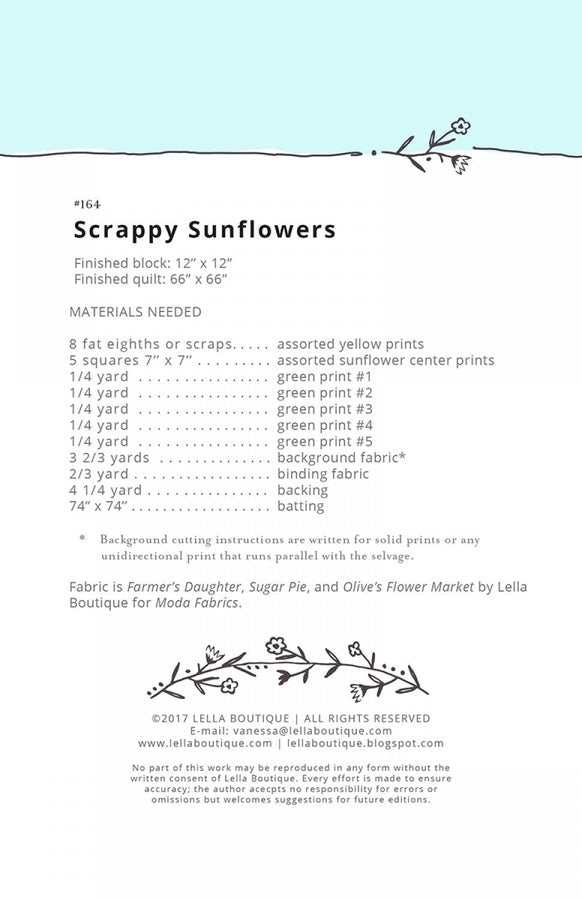 Lella Boutique, Scrappy Sunflowers- scrappy, fun and scrap friendly. Finished blocks are 12x12" and finished quilt is 66 x 66".