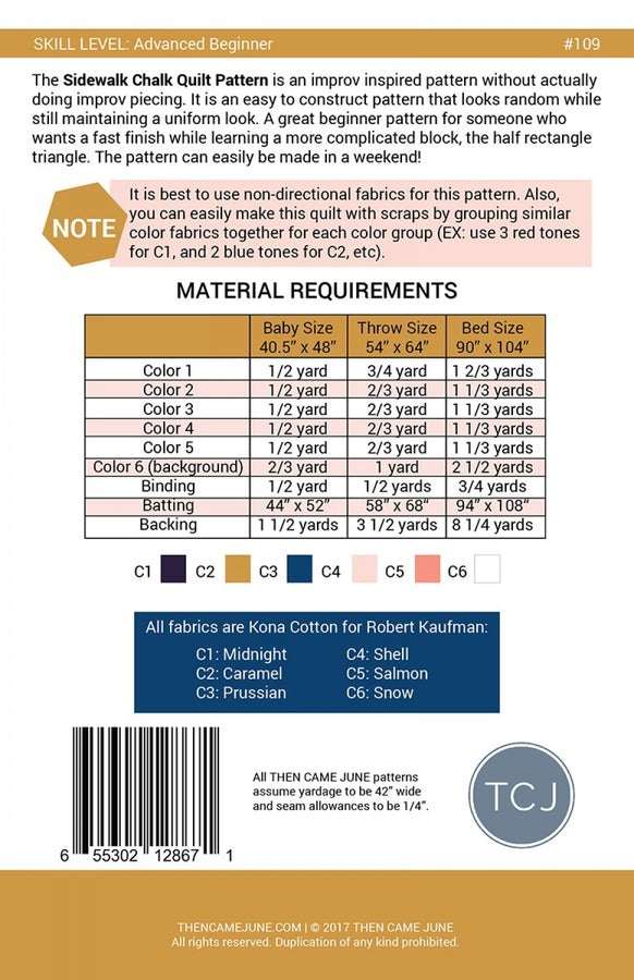 Then Came June, Sidewalk Chalk Quilt- 3 sizes provided; Baby 40-1/2in x 48in, Throw 54in x 64in, Bed 90in x 104in. An advanced beginner improv inspired pattern without doing improv piecing. It is easy to construct and a super fast finish.