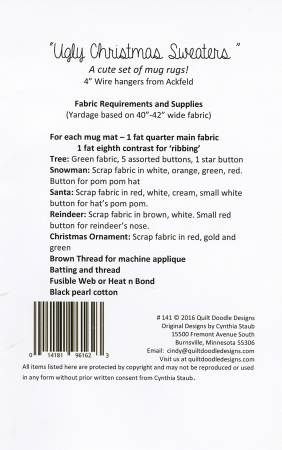 A cute set of mug rugs for the holidays. These sweaters are so ugly they are cute! Attach the mug rugs to a 4" hanger and you have an ornament. These are super fun to make!