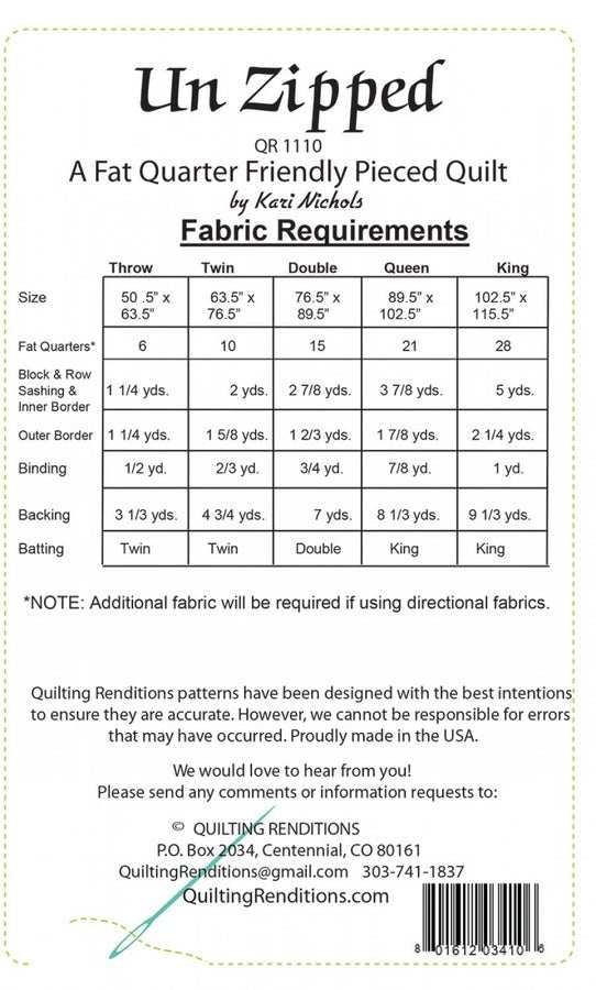 Quilting Renditions, Un Zipped- Love using up those fat quarters! Sized from baby to king, your options are endless. Nice big pieces to show off those lovely fabrics!