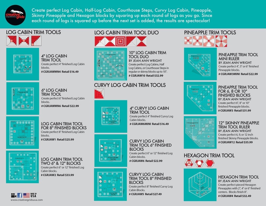 Creative Grids Log Cabin or Pineapples Booklet- Creative Grids offers a wide selection of Log Cabin, Curvy Log Cabin and Pineapple rulers to help accurately create a wide variety of blocks. Now you can easily find them in this handy reference guide.