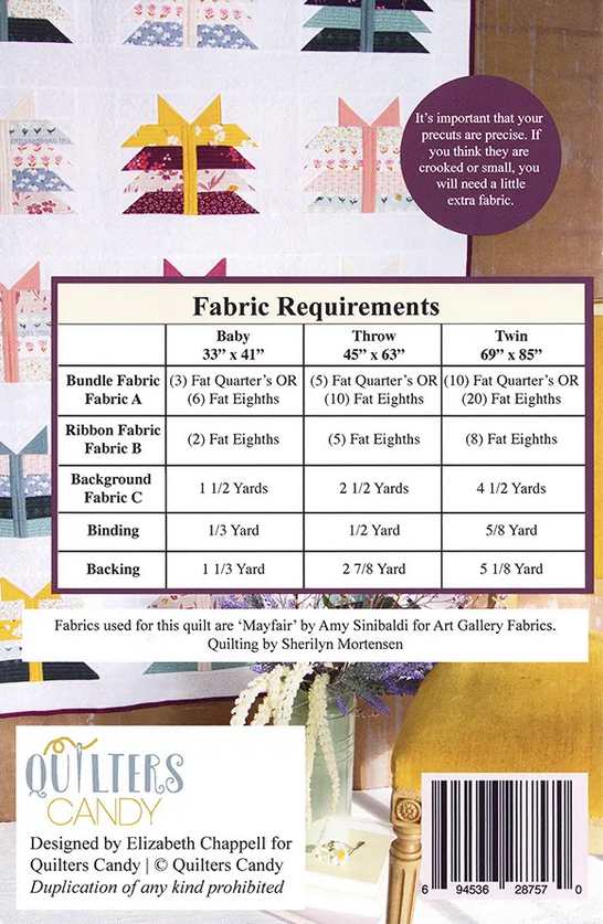 Quilters Candy, Bundles of Joy- Recreate the beauty of a perfect fabric bundle wrapped in a bow with the Bundles of Joy pattern. Piece this precut friendly pattern together for a delightful addition to any quilters home.