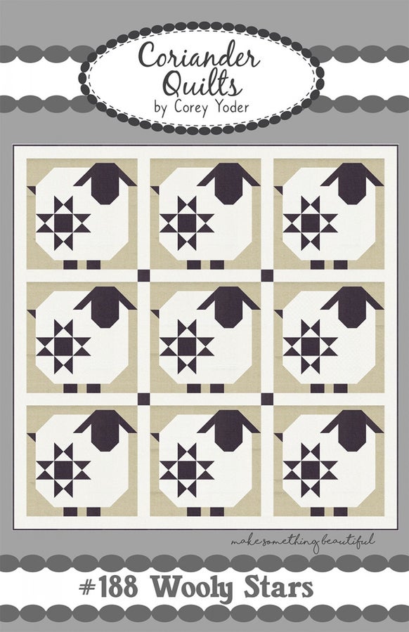 Coriander Quilts, Wooly Stars- finishes at 62" x 62". It is a fat quarter friendly quilt designed to work perfectly with the Coriander Seeds line of fabric. The pattern is a full color, booklet style pattern.