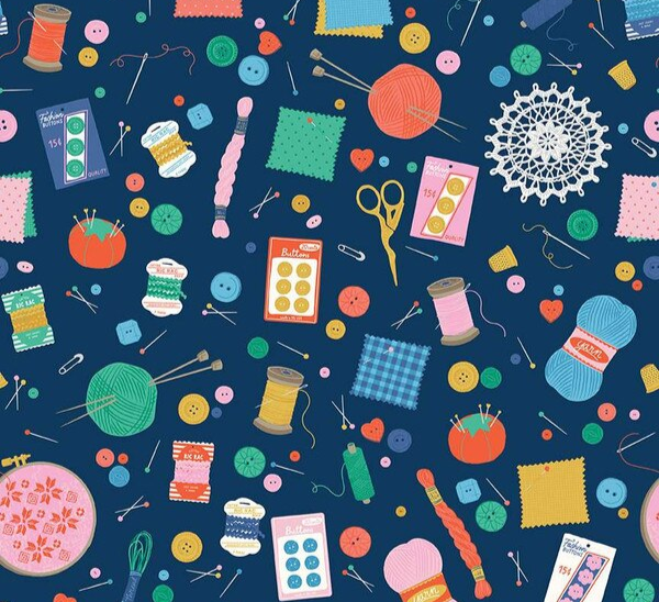 Hand Made Navy Notions C16590-NAVY by Amber Kemp-Gerstel of Damask Love for Riley Blake Designs. Sold in 1/2 Yard Increments