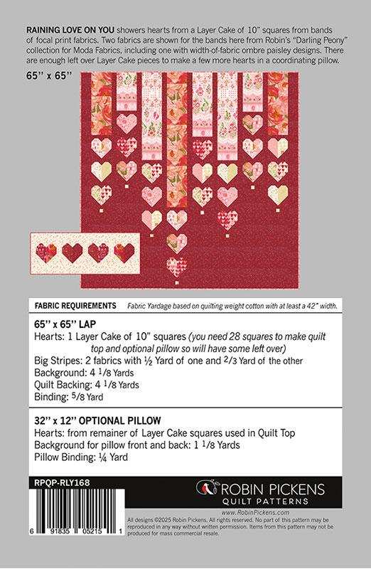 Introducing the printed pattern Raining Love on You by Robin Pickens for Moda Fabrics. The pattern feature fabric from the Darling Peony collection in a Valentine's inspired heart display.