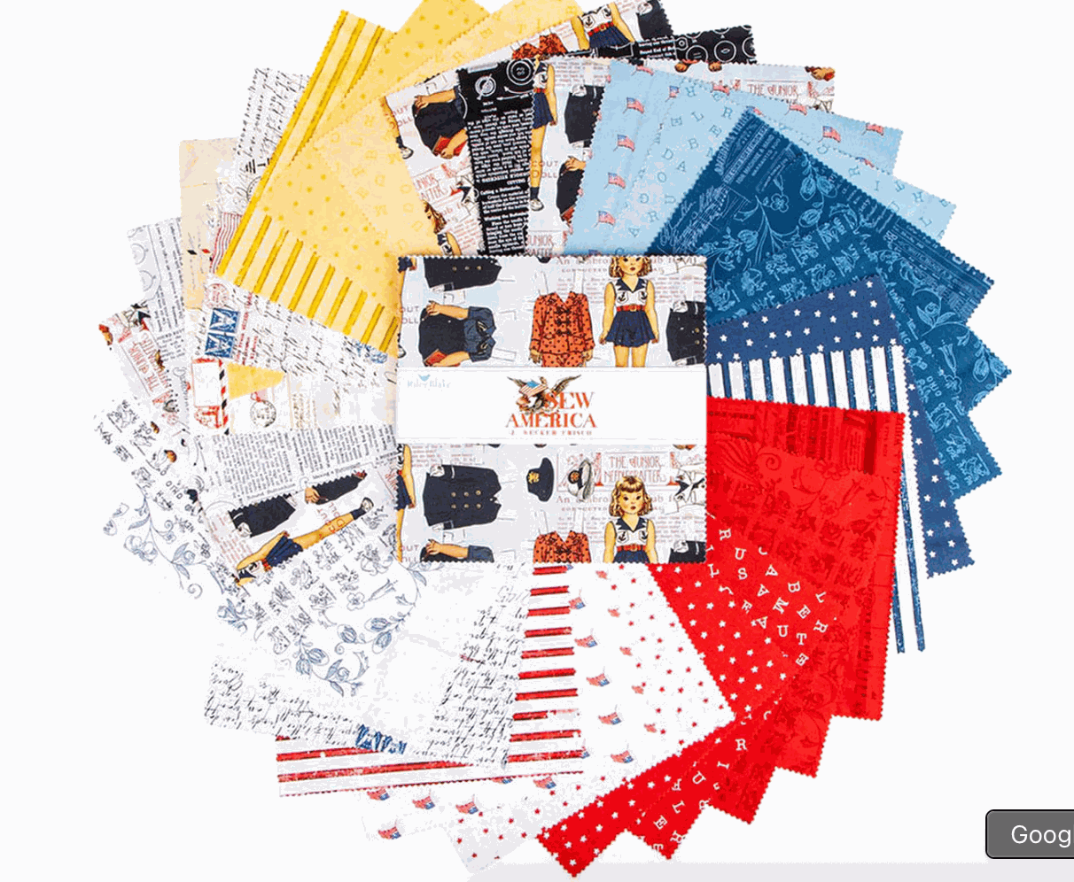 Sew America blends nostalgia with Americana, featuring motifs like WWII correspondence, retro sewing notions, and patriotic colors!