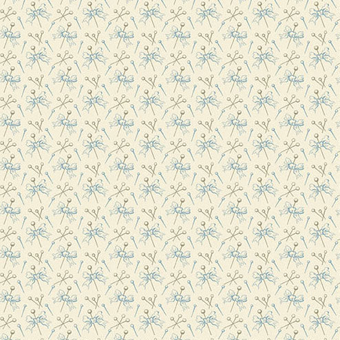 This collection features a classic palette of soft blues and neutrals, including cream, adorned with floral and bird motifs, as well as sewing-themed elements like thread spools and scissors. The collection is designed to evoke a sense of timeless elegance, reminiscent of the "Bluebird" collection also by Edyta Sitar.