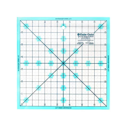 Lori Holt Cute Cuts Trim It 7.5" Square Ruler features a .25" seam allowance and aqua markings printed in 1" grids marked in .125" and .25" increments. Use the vertical, horizontal and diagonal lines to perfectly align and trim blocks.