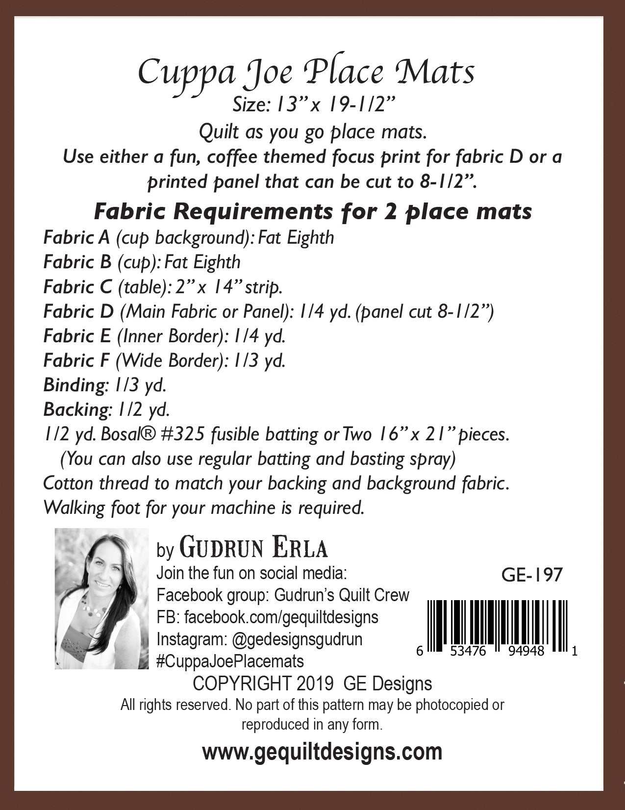 Add a touch of charm to your dining table with the Cuppa Joe Place Mats! This beginner-friendly Quilt As You Go pattern allows you to create 13” x 19 ½” place mats effortlessly, using either a printed fabric panel or your favorite focal print. Whether you're crafting for your home or a thoughtful gift, this project comes together quickly with simple, step-by-step guidance.