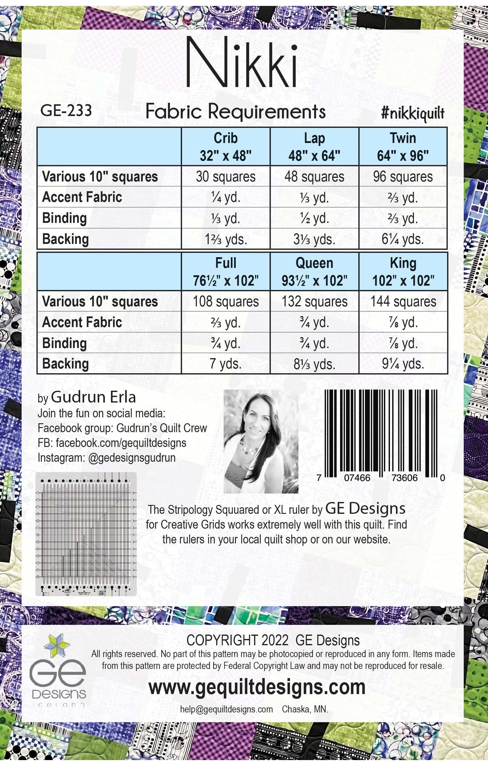 This fun, geometric pattern is much easier to make than it looks. The pattern has 6 different size options. Make it with assorted 10" squares and an accent fabric, we recommend using the Stripology Squared or the Stripology XL ruler by GE Designs. Instructions for using regular rulers are included. The pattern comes with 6 different size options: crib, lap, twin, full, queen, king.