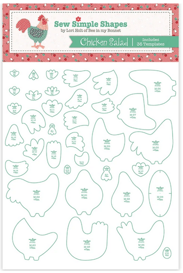 Lori Holt of Bee in my Bonnet has created 36 Chicken Salad templates for an endless variety of designs using your applique method of choice. Made of sturdy plastic, they have center marks and are see-through for fussy cutting.