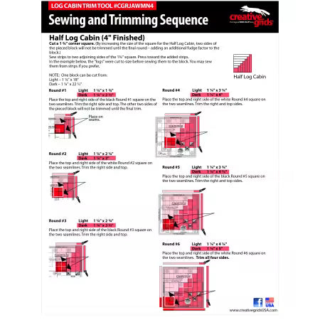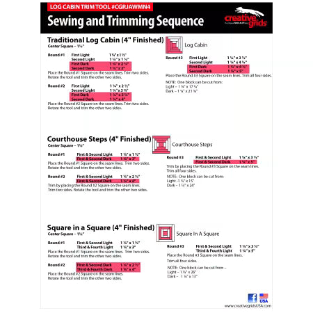 This Log Cabin Trim Tool designed by Jean Ann Wright, for Creative Grids®, creates perfect 4in finished Log Cabin, Half Log Cabin, and Courthouse Step blocks.