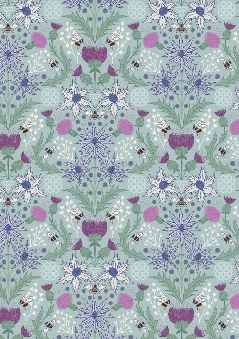 A Celtic Summer from Lewis & Irene Fabrics. Mirrored Thistle and Bee on Duck Egg