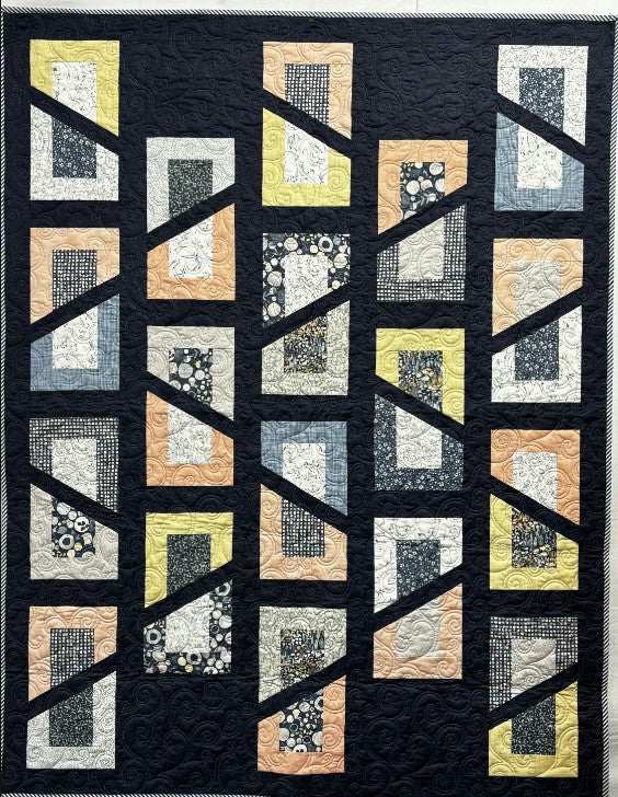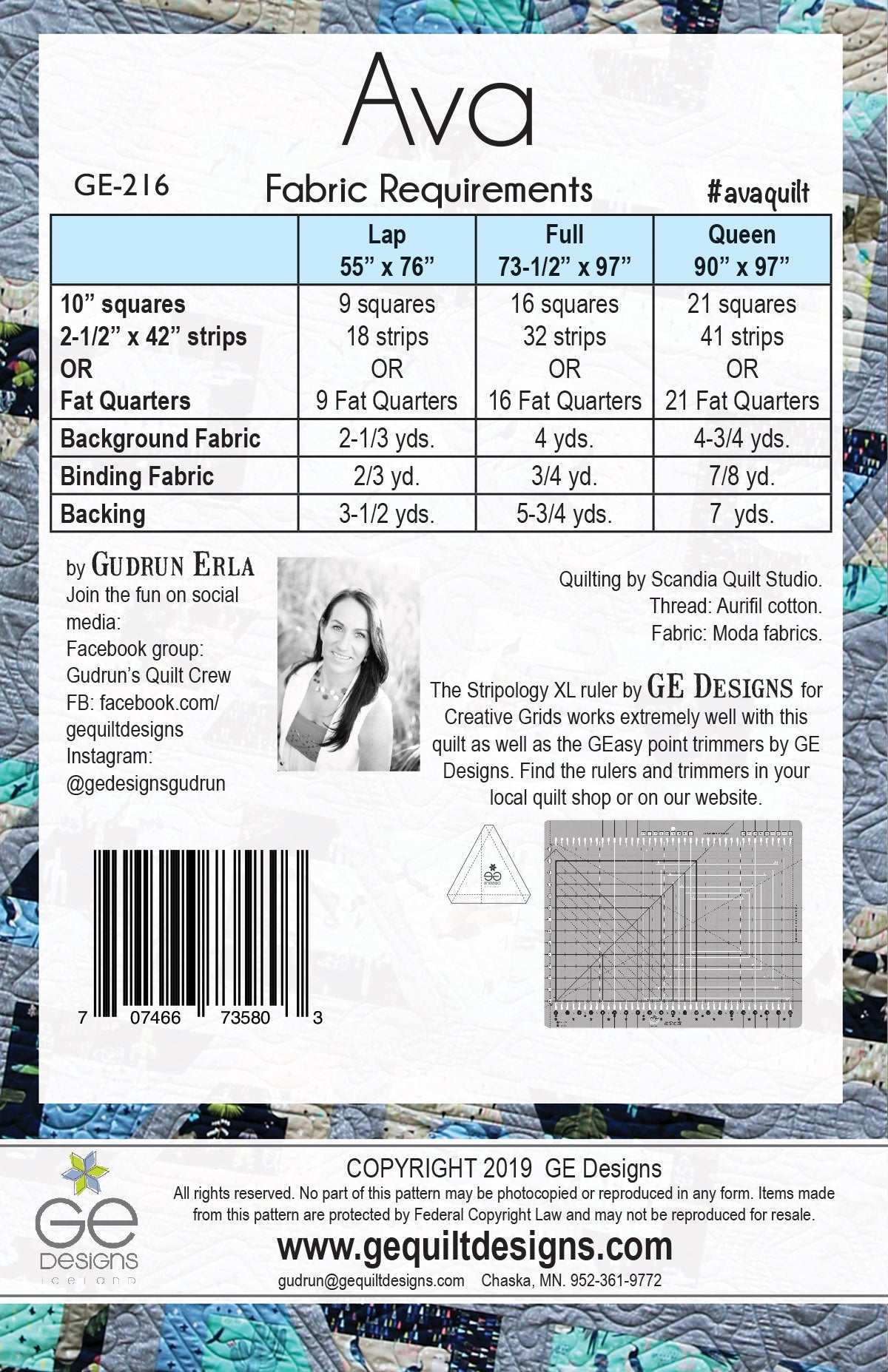 Make this fast and contemporary looking quilt with 10" squares and 2-1/2" strips. Ava is perfect to use fun, novelty prints and the Stripology XL ruler by GE Designs makes the construction quick and easy, especially with the help of the GEasy point trimmers. Instructions for using regular rulers are included. The pattern comes with 3 different size options: lap, full, queen.