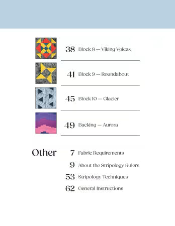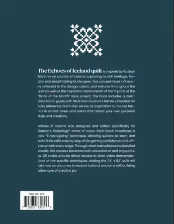 Inspired by Gudrun Erla’s Icelandic roots and featuring her new Heima fabric collection for Andover, Echoes of Iceland is a 10-part Block of the Month book designed for confident beginners and experienced quilters alike. The book includes full instructions for a 74” x 82” quilt and an optional pieced backing. The instructions use the time-saving and accuracy improving techniques of the Stripology® rulers and as you work your way through the pattern, you learn and practice features of the rulers.