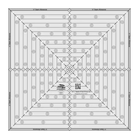 The 14-1/2in Square It Up or Fussy Cut Square designed by Penny Haren for Creative Grids® has horizontal, vertical, and diagonal markings to make squaring up your blocks up to 14-1/2in squares a breeze.