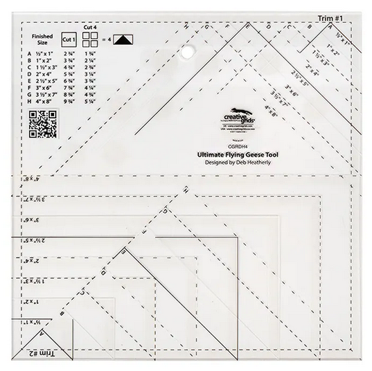 The Creative Grids Ultimate Flying Geese Ruler helps you create flying geese units faster, easier and accurately. Accomplish finished blocks with perfect triangles every time. Make units from sizes 1" x 2" up to 4" x 8" finished blocks. This ruler features the cutting requirements for each size printed clearly on the ruler. You can also use this ruler to trim down over-sized units made using your preferred method. Gripper holds fabric while cutting when pressure is applied.