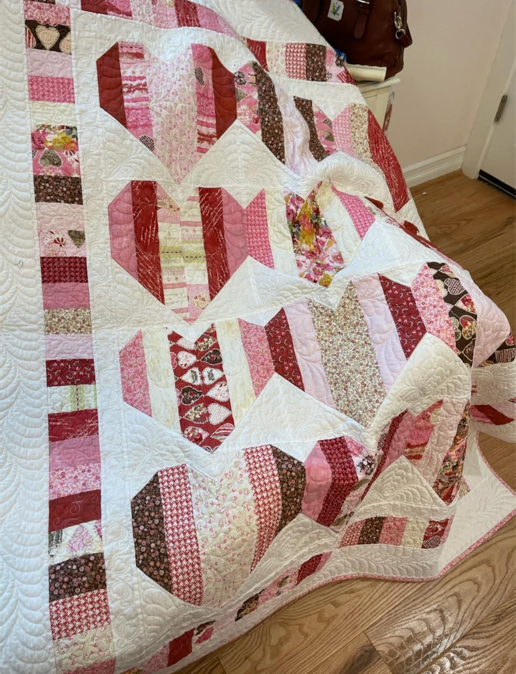 Black Mountain Needleworks, Heartstrings- This adorable quilt is QUICK and EASY with precut 2-1/2" jelly roll strips (or twelve 1/4 yard cuts). Finished size 56in x 68in