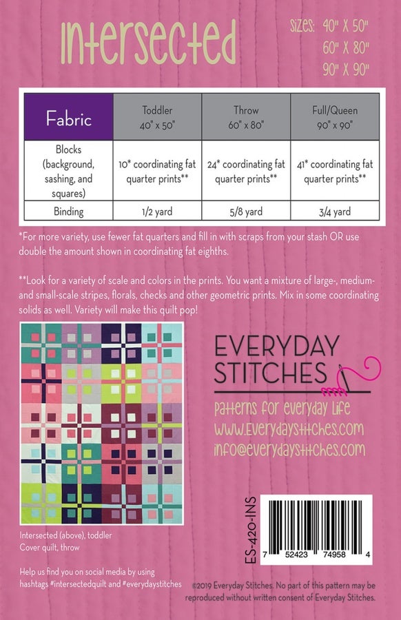 Everyday Stitches, Intersected- Designed to use every bit of a fat quarter (10, 24 or 41 depending on size), it is the perfect quilt to use that FQ bundle you’ve been hoarding! Easy, straight-line piecing in simple units makes the top go together fast. All Everyday Stitches patterns are thoughtfully created and thoroughly tested for accuracy and fun! Pattern include instructions to make the quilt in three sizes: Toddler: 40" x 51" Throw Quilt: 60†x 80" Full/Queen Quilt: 90" x 90"
