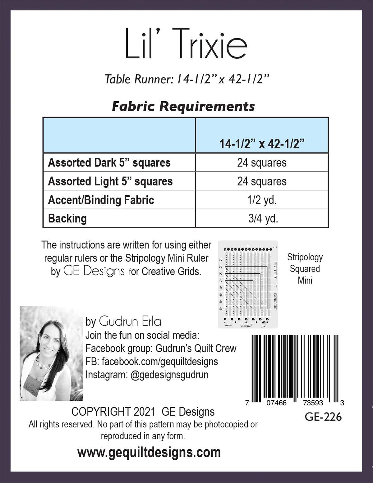 Just like all her Lil' sisters, Lil' Trixie comes together quickly and simply with the Stripology Squared Mini Ruler, light and dark 5" fabric squares, and an accent fabric. Full color instructions include how to use regular rulers as well. Size 14-1/2" x 42-1/2".