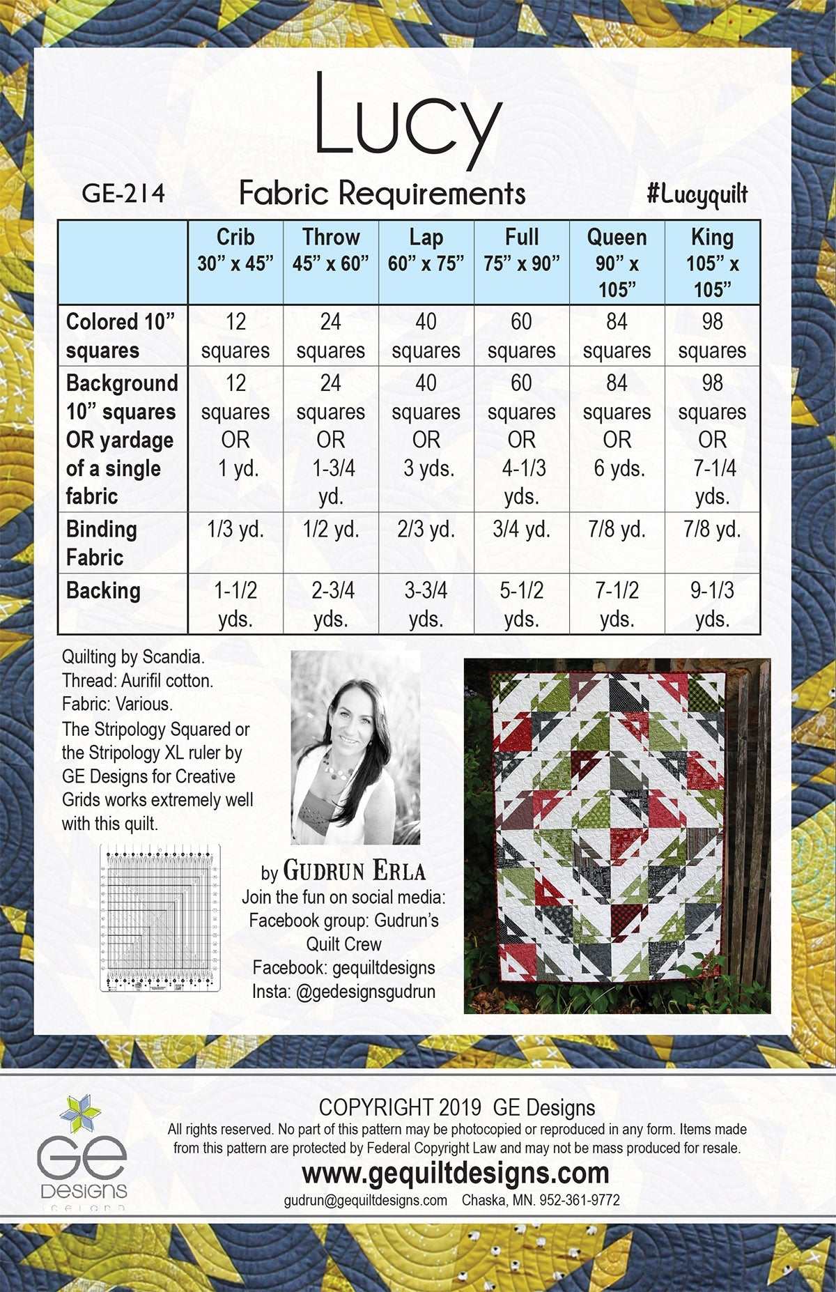 This phenomenal pattern is so versatile and much easier to make than it looks. The pattern has 4 different layout options and endless variations. Make it with assorted 10" squares and a background or just 2 fabrics, using the Stripology Squared or the Stripology XL ruler by GE Designs and be successful every time. Instructions for using regular rulers are included. The pattern comes with 6 different size options: crib, throw, lap, full, queen, king.