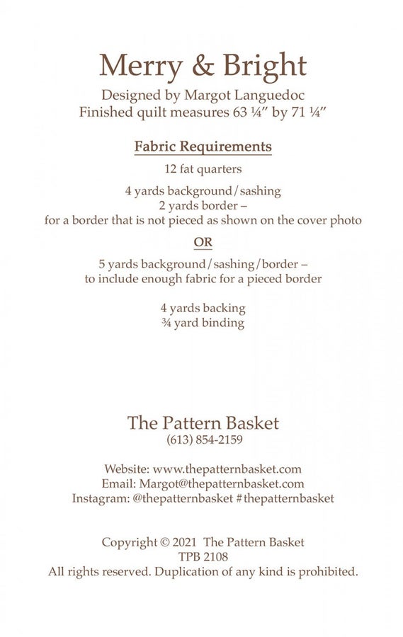 The Pattern Basket, Merry & Bright- Finished size is 63-14 x 71-1/4". This is a pieced quilt pattern.