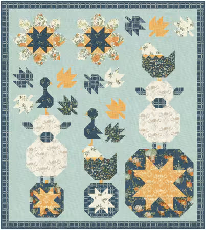 59" x 66" fall themed lap quilt featuring I Love Fall Most of All by Deb Strain. Includes flower, leaf, duck chicken, sheep and pumpkin blocks. Fun quilt for snuggling in the cool autumn air.