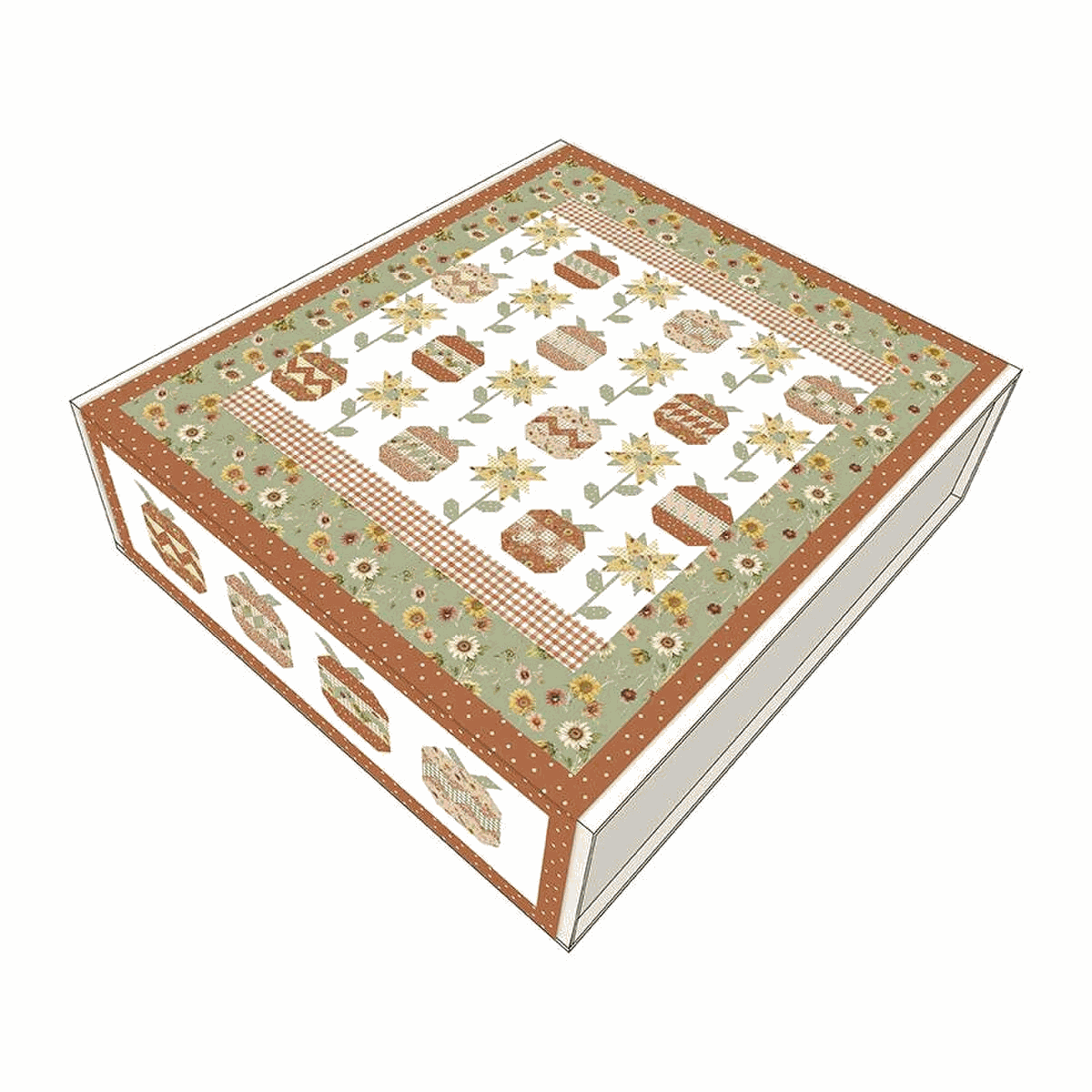 Introducing the Fall Garden Quilt Kit featuring the Sunflower Whispers collection by Lisa Audit. Pattern is by LaVonne Jackson of Sew-N-Quilt. Finished size is 84" x 84". Kit comes in a solid box with a printed belly band label. Box size is approximately 11" x 12 1/4" x 3 1/2". Boxed kit includes the pattern and the fabric for the quilt top and binding.
