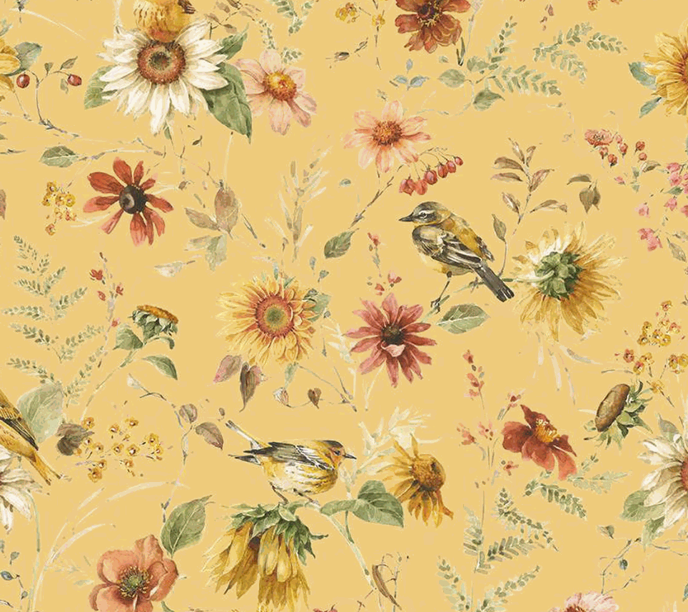 Sunflower Whispers by Lisa Audit for Riley Blake Designs is great for quilting, apparel and home decor. This print features sprigs of flowers and leaves with birds. It's 107"/108" wide to accommodate most quilt backs.