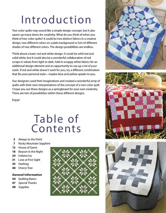 Annie's Quilting, Two-Color Quilts- Get inspired by these eight different two-color quilts! It is a perfect combination of classy throw and bed quilts! Featured Designers: Nancy Scott, Chris Malone, Jennifer Thomas, Wendy Sheppard, Lyn Brown, Carolyn Cullinan McCormick, TeriAnn Harms & Cassie Harms.